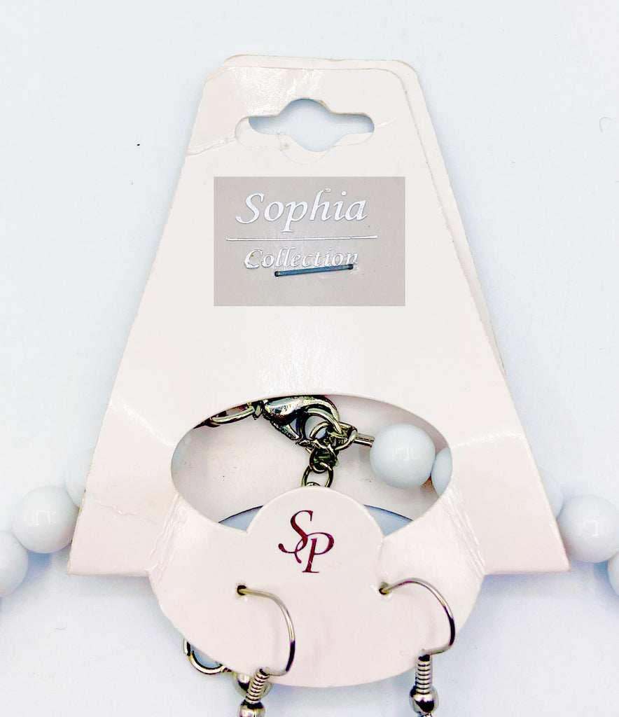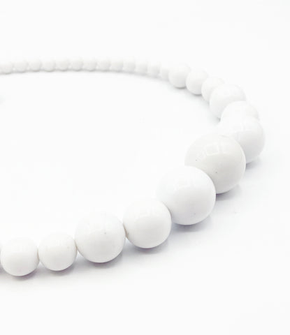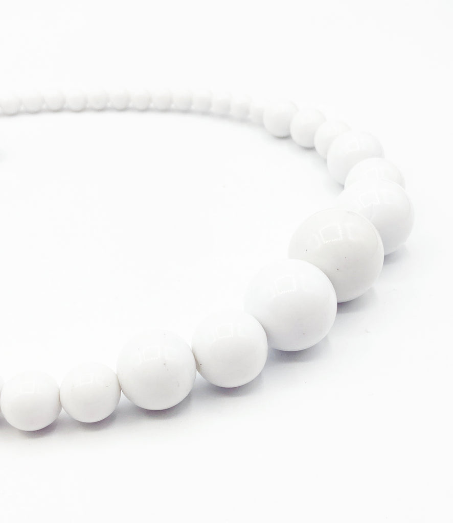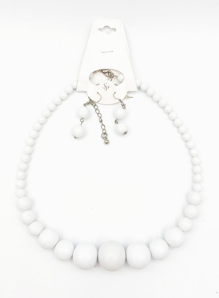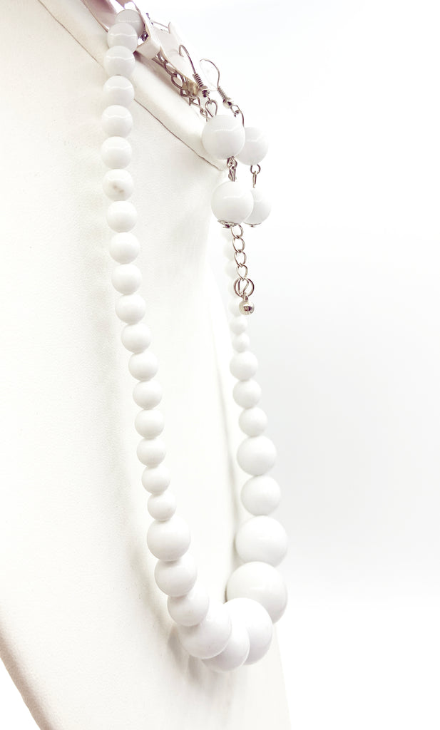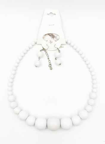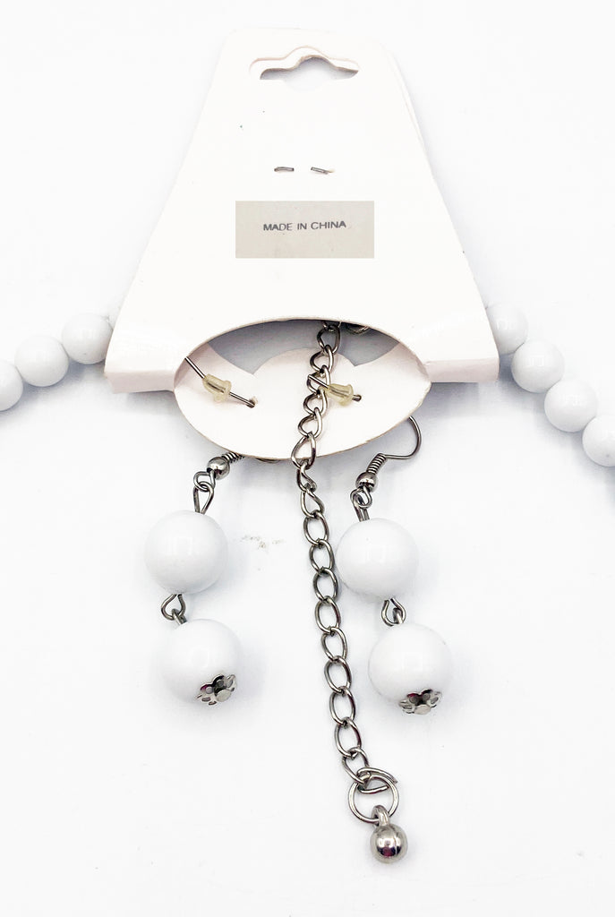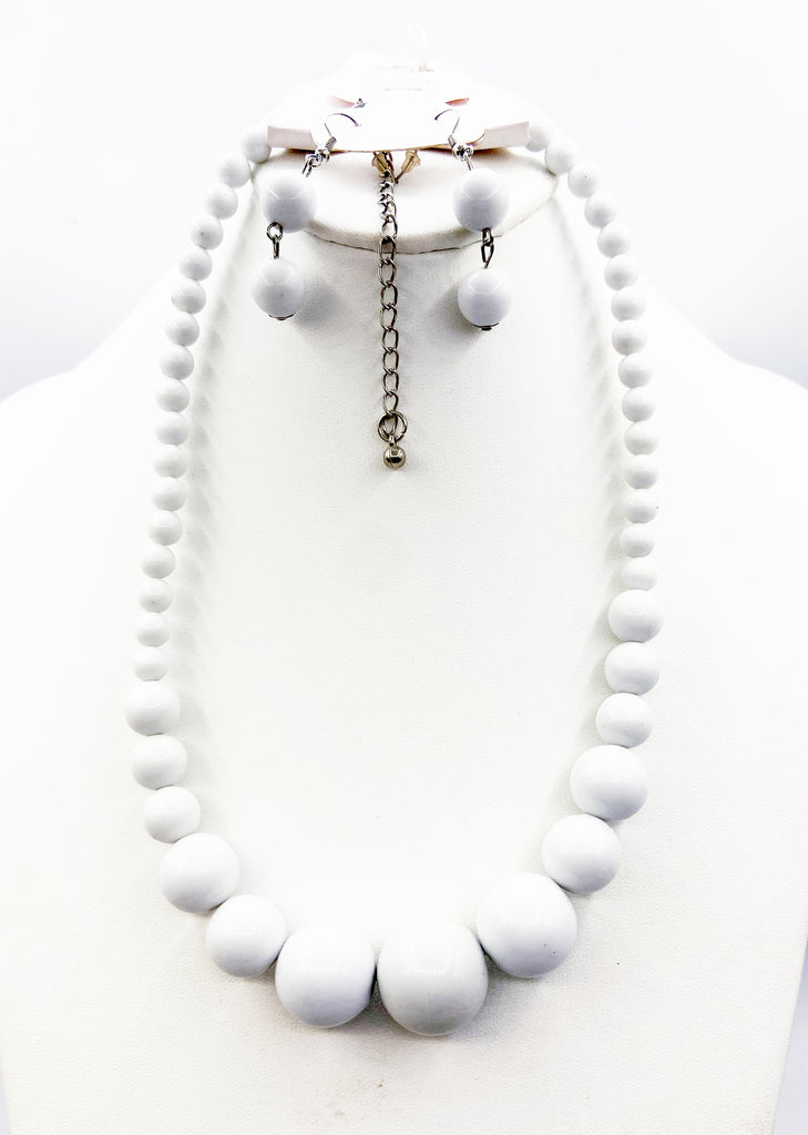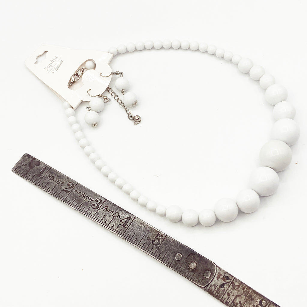 This classic white bead necklace has a graduated size section in the center with one large white bead surrounded by 6 progressively smaller beads and then a long section of small white beads on either side. Matching dangle earrings have two white beads on silver-tone rods.