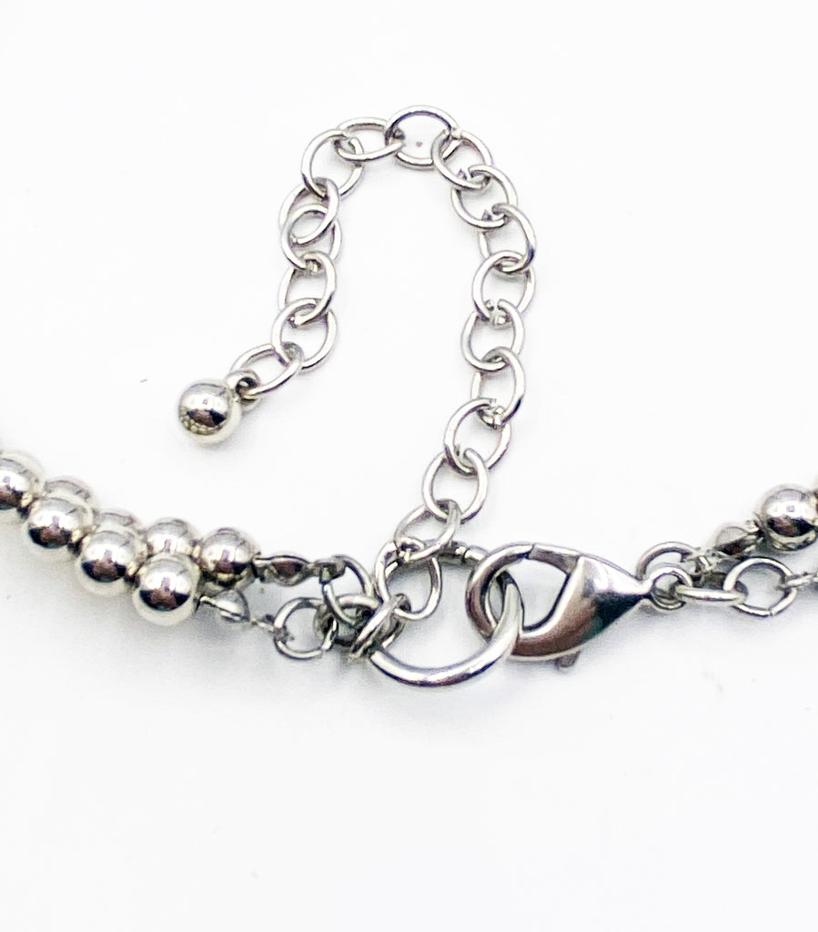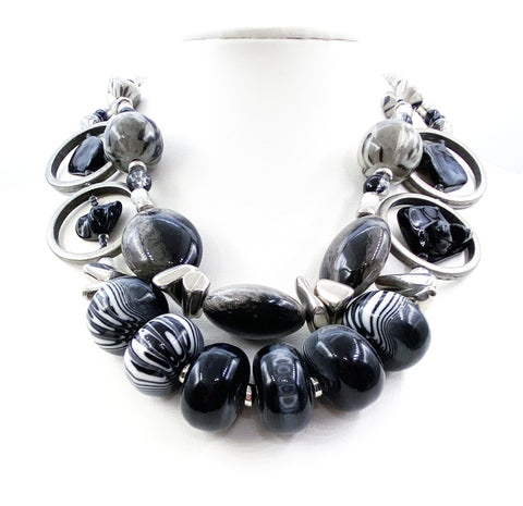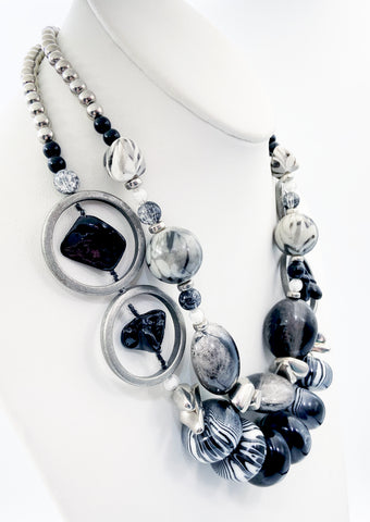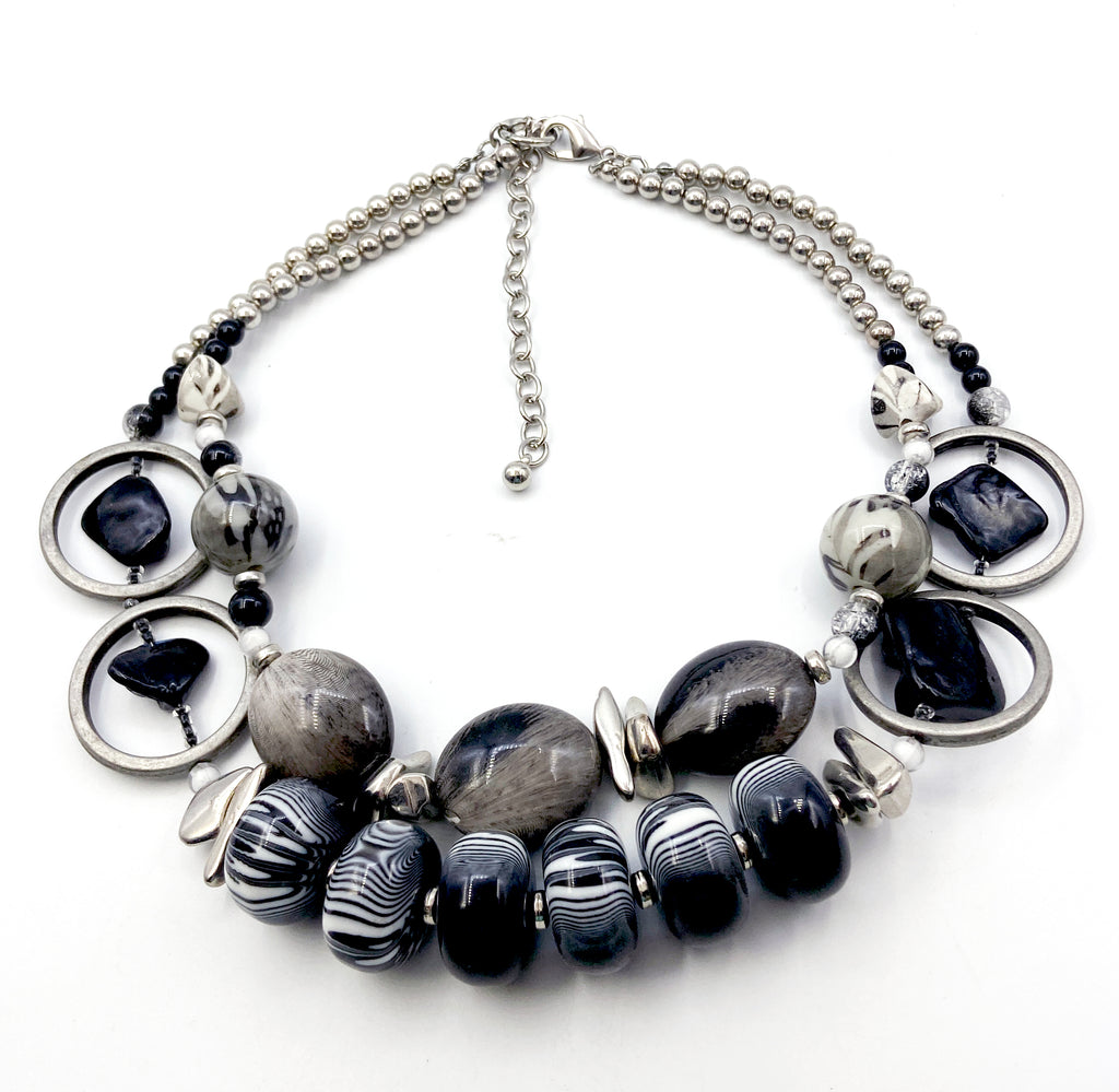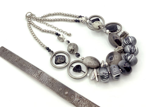 This chunky bead necklace has a sweet mix of interesting plastic beads, including four large circle beads with suspended centers, swirled grey and white round and triangular beads, silver-tone flat triangular beads with grey and black zebra stripe fat disc beads in the center. Silver-tone small round beads are at the ends around the neck.