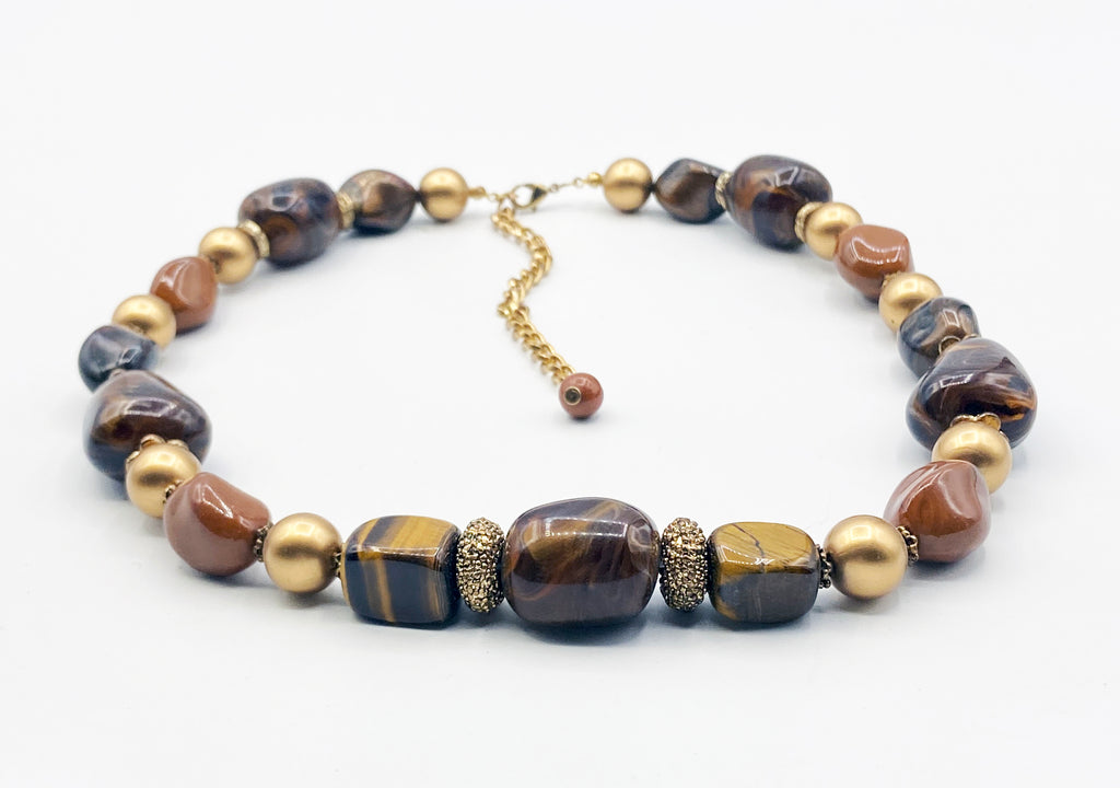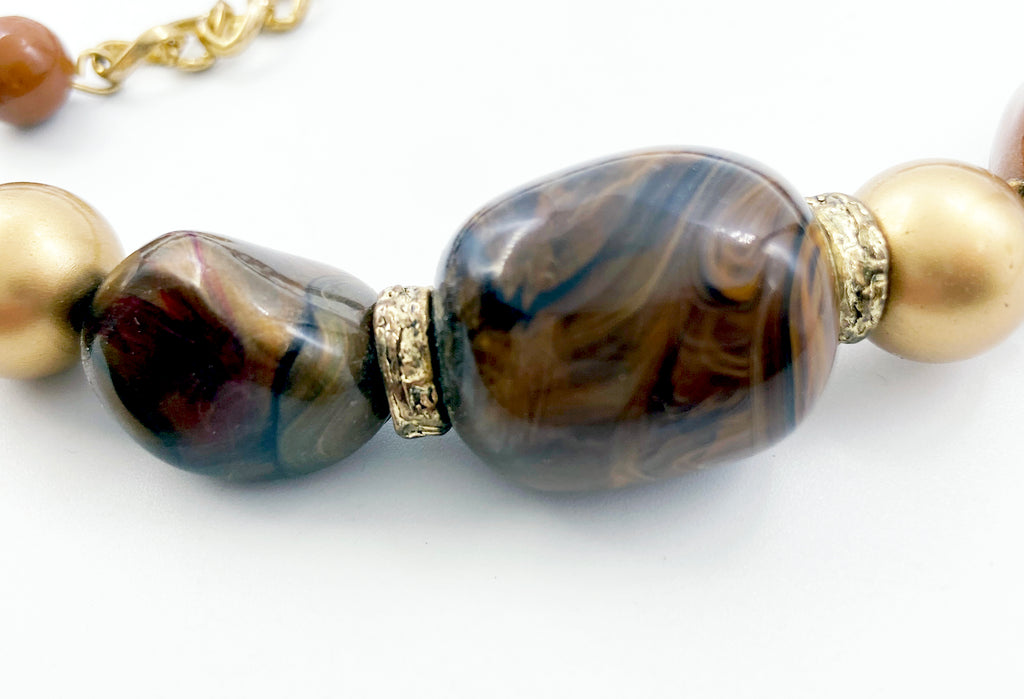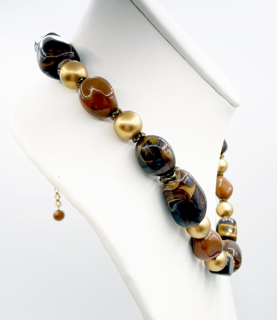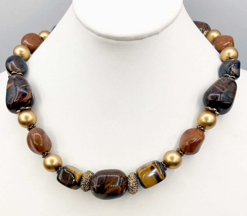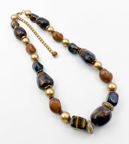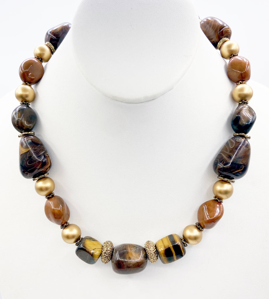 This earth-tone bead necklace has two chunky rectangular tiger's eye beads with a lovely pattern of swirled glass and plastic beads interspersed with round golden beads with golden flat spacers for an earthen fall forest feel.